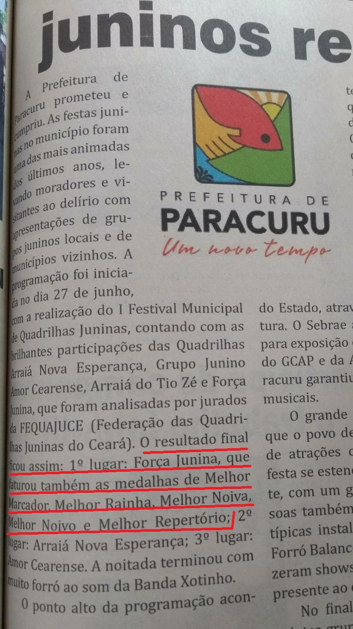 A trajetória de conquistas da Quadrilha Força Junina é apreciável, pois em apenas 12 anos de existência detêm seguintes títulos: Tricampeã circuito Sesc ativo, Hexacampeã municipal, Vice-campeã da etapa Ceara Junino e dentro outro...